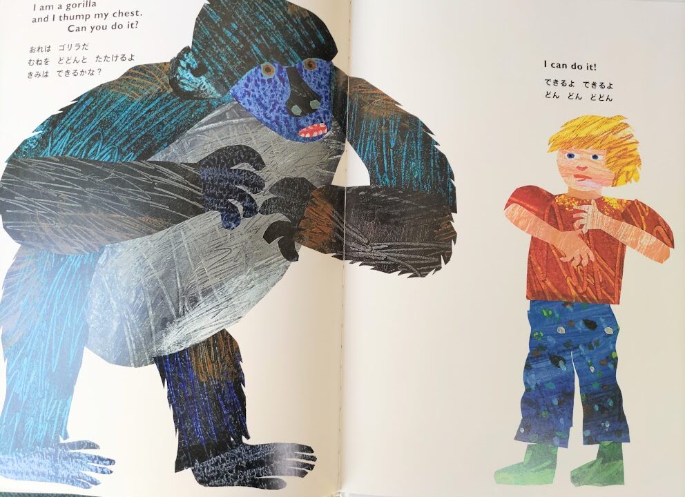 また、文法的に ” I am (動物)~ and I (その動物のすること).” の繰り返しなので、基本的な英語の表現が身に付きます。